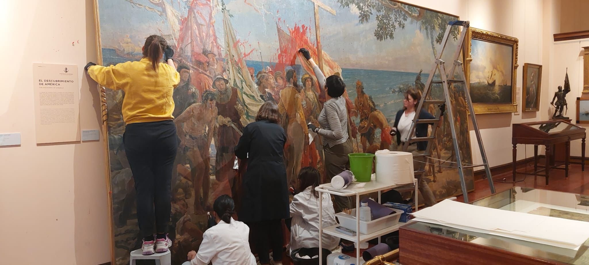 Muzeum okamžitě začalo s čištěním obrazu. "Náš skvělý tým profesionálů pracuje na opravě obrazu První pocta Kryštofu Kolumbovi od Josého Garnela. Námořní muzeum bude i dál hrdě zobrazovat stránky španělské historie psané z moře," uvedlo Museo Naval na sociálních sítích.