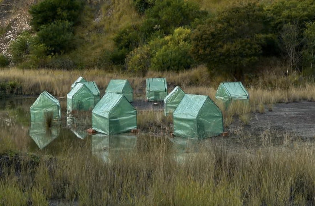 V mokřadlech postavil jednoduché malé sauny s malým otvorem pro vstup žabek. Na jejich konstrukci použil tmavé cihly a kolem nich postavil domečky z fólie. Tmavé cihly podle něho dokážou přitáhnout dostatek slunečních paprsků a fóliovník teplo uvnitř sauny udrží.