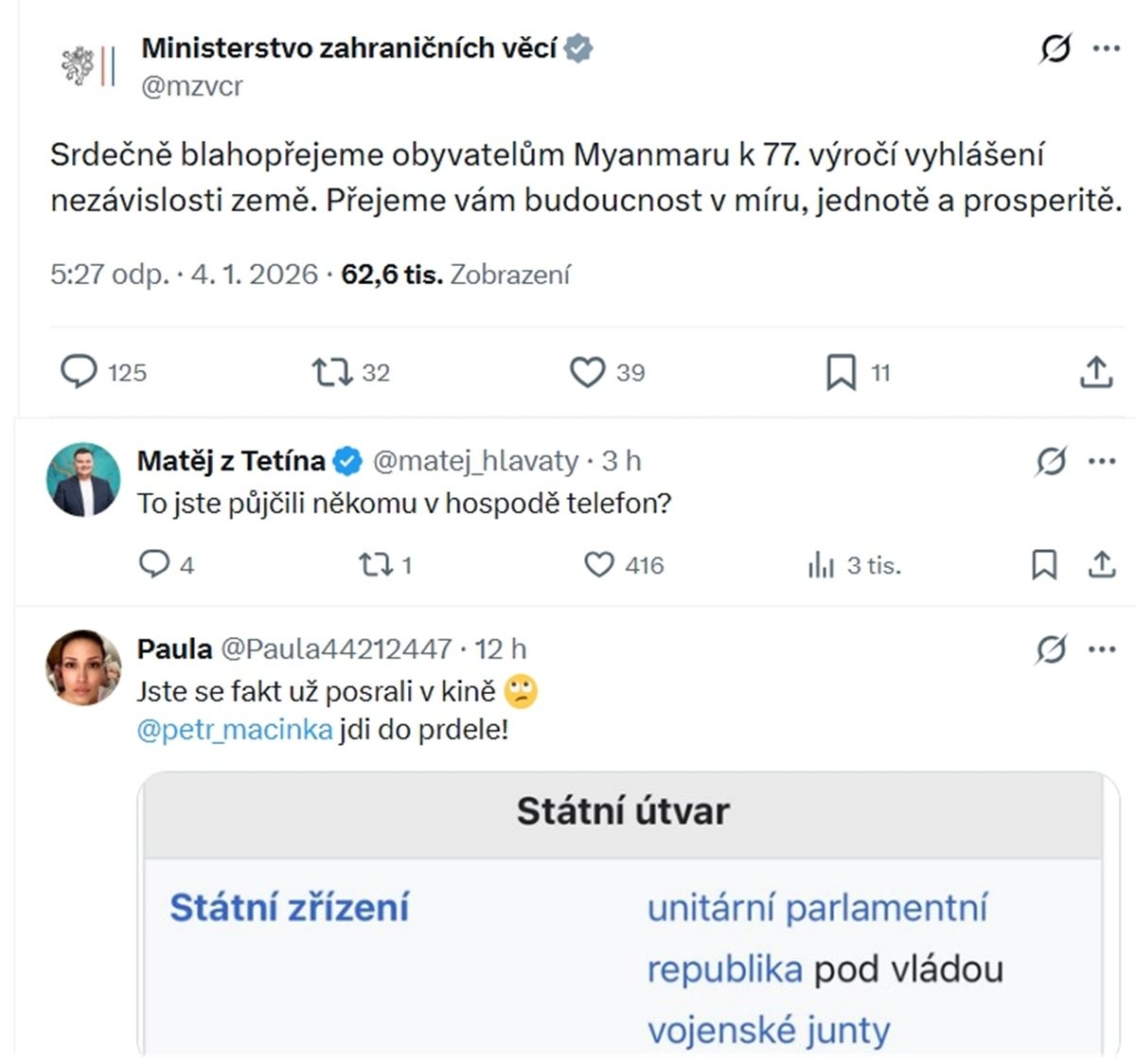 Ministerstvo zahraničí pod vedením Petra Macinky (Motoristé) přišlo na sociálních sítích s bizarním příspěvkem. "Srdečně blahopřejeme obyvatelům Myanmaru k 77. výročí vyhlášení nezávislosti země. Přejeme vám budoucnost v míru, jednotě a prosperitě," napsalo. Příspěvek je o to absurdnější, že zemi vládne vojenská junta, jejímž jedním z mála spojenců je Rusko, který ji poskytuje diplomatickou legitimitu a je hlavním dodavatelem zbraní pro myanmarskou armádu. Myanmar vyhlásil nezávislost v roce 1948, jde tak navíc o 78. výročí. A o nezávislosti se mluvit rozhodně nedá. Po celou dobu zemí zmítají etnické spory a trvá v ní tak jedna z nejdelších občanských válek na světě. Organizace spojených národů hlásí soustavné a systémové porušování lidských práv v zemi. Další informace v infoboxu pod článkem.