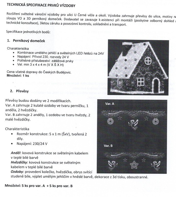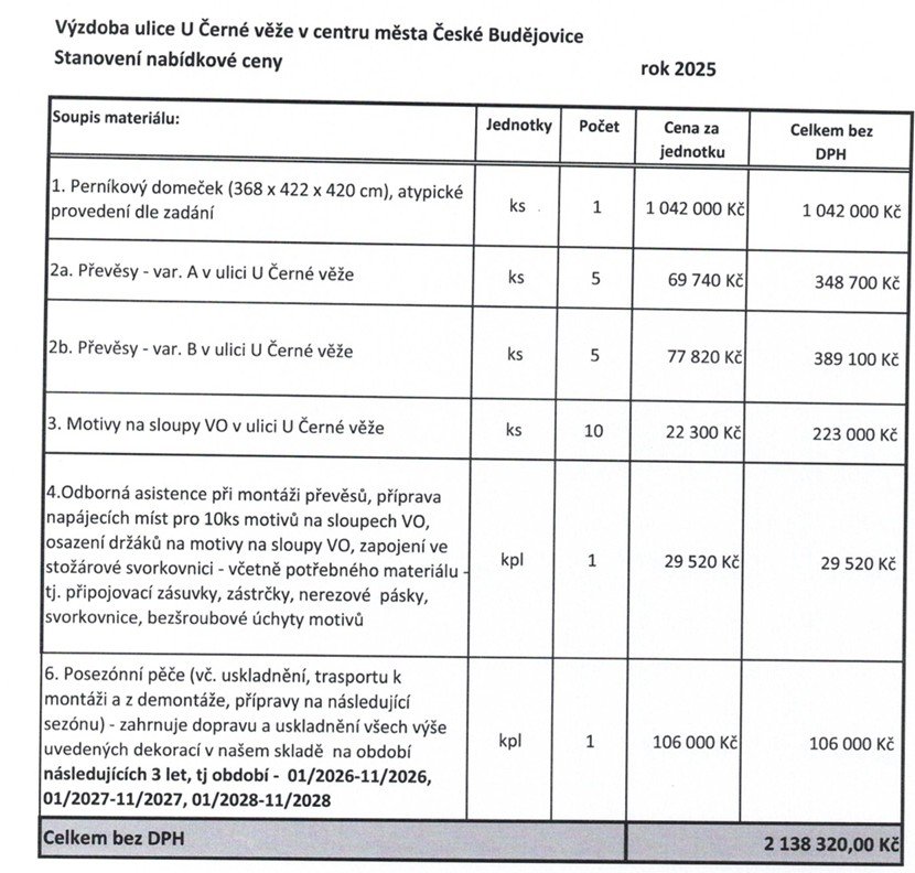 Výrobce chaloupku má ve svém katalogu, neuvádí u ní ale cenu. Za o něco menší světelné objekty ale chce v přepočtu maximálně 150 tisíc korun. Zvláštní jsou i ceny za dekorace na sloupy veřejného osvětlení v Budějovicích. Za deset přívěsů dalo město od 69 do 78 tisíc za kus. Výrobce ve svém e-shopu nabízí nejdražší za 21 tisíc, před slevou za 37 tisíc. Motivy na sloupy, za které Budějovice zaplatily 22 tisíc, byly v e-shopu za 26 tisíc, aktuálně stojí 13 tisíc.