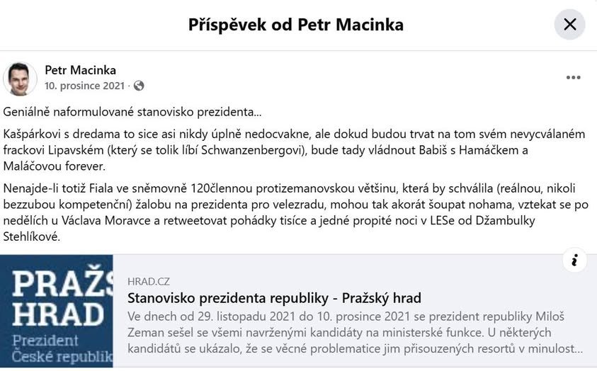 Melodie slovenské lidové písně Macejko s textem o ministru Petru Macinkovi od autora Tomáše Hrona.
