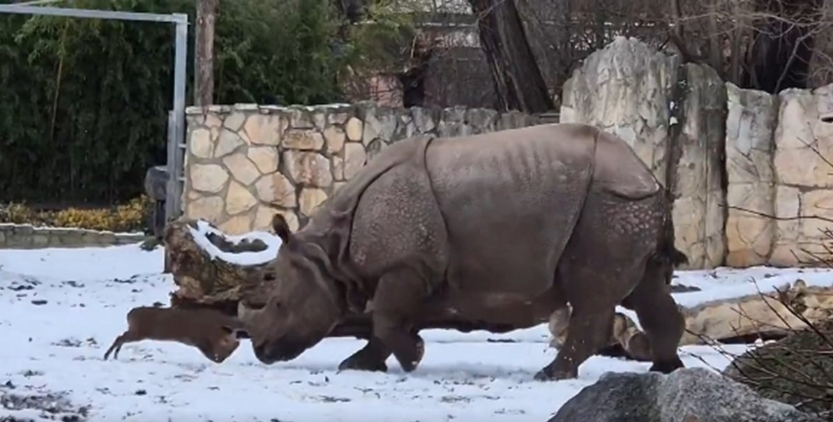Vyzyvatelem k souboji je čínský muntžak – malý druh jelena z Asi, který se odvážně snažil dokázat, kdo je ve výběhu pánem. Vyskakoval si přitom na toho největšího, kdo byl k dispozici. Jeho soupeř, nosorožec, 130krát těžší.