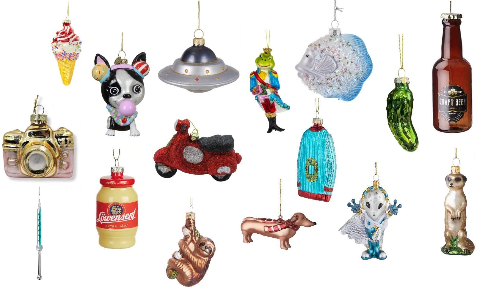 Zvláštně vypadají i ozdoby v podobě jídla a pití, třeba kyselá okurka, sklenka s hořčicí, lahev piva, plechovka coly nebo zmrzlina.