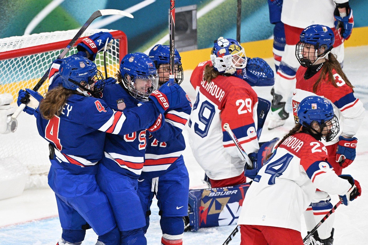 České hokejistky vstoupily do olympijského turnaje utkáním proti Spojeným státům americkým. Favoritky diktovaly tempo už v první třetině, český výběr přestřílely a také otevřely skóre. V 16. minutě využila přesilovou hru Alex Carpenterová, která přesnou střelou čtyři minuty před první sirénou poslala USA do vedení.