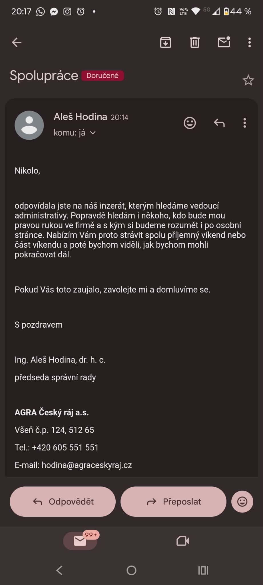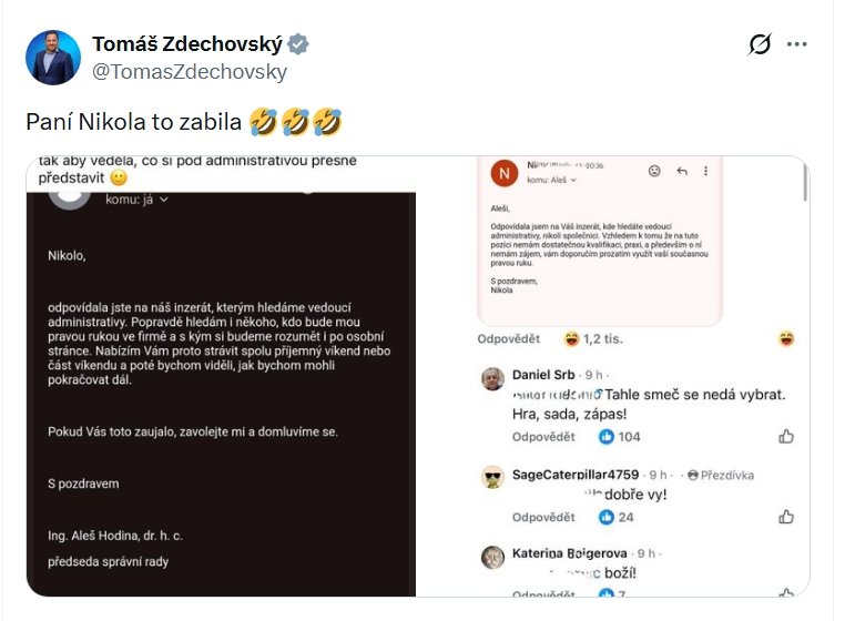 O práci v administrativě ve firmě Agra Český ráj v Turnově projevila zájem mladá žena Nikola. Předseda představenstva ji prý poslal šokující odpověď. „Hledám někoho, kdo bude i mou pravou rukou ve firmě a s kým si budeme rozumět i po osobní stránce. Nabízím vám proto spolu strávit příjemný víkend nebo část víkendu a poté bychom viděli, jak bychom mohli pokračovat dál,“ napsal Hodina. Nikola reagovala s nadhledem: „Odpovídala jsem na váš inzerát, kde hledáte vedoucí administrativy, nikoli společnici. Vzhledem k tomu, že na tuto pozici nemám dostatečnou kvalifikaci, praxi, a především o ni nemám zájem, vám doporučím prozatím využít vaši současnou pravou ruku,“ odpověděla.