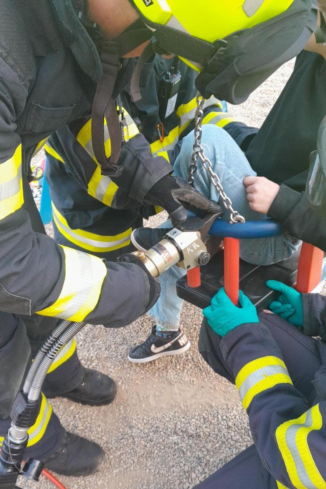 Jen o dva později se do pasti v podobě houpačky na dětském hřišti Kochmanka v Kralupech nad Vltavou dostalo desetileté děvče. Přivolaní kralupští profesionální hasiči museli hydraulickým nářadím konstrukci sedačky opatrně přeštípnout, aby uvolnili nohu zaháknutou za opěrku.