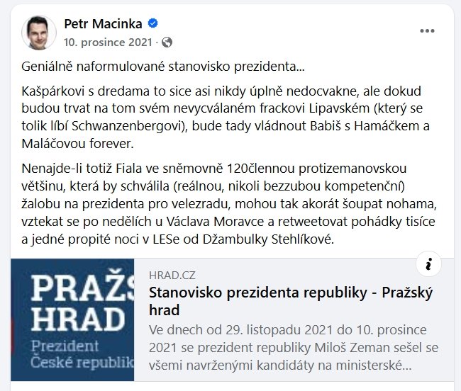 Teď, když prezident Pavel odmítl jmenovat Filipa Turka a používá podobně tvrdé argumenty o jeho nevhodnosti jako ministra, Macinka to označuje za ústavní faul, přestože sám v roce 2021 Zemanův podobný postup vůči Lipavskému vřele podporoval a sám používal mnohem drsnější výrazy.
