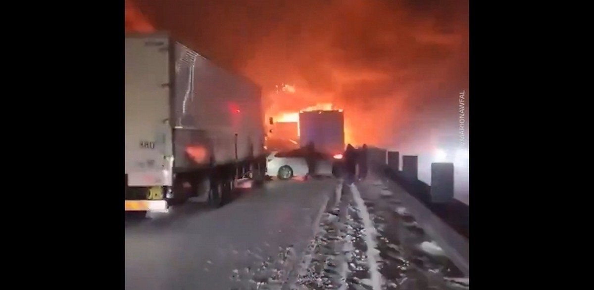 Podle dálniční policie došlo k první srážce kolem 19:25 tamního času, když nákladní vůz dostal smyk a zastavil bokem na silnici. Zezadu do něj vrazi kamion a následovala řetězová reakce, kdy další auta havarovala, když se řidiči snažili vyhnout kolizi. Jedno z aut začalo hořet a plameny se rychle rozšířily na další dvacítku vozů.
