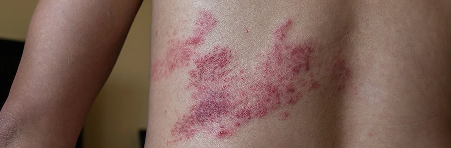 Projevuje se palčivou bolestí v oblasti krku, ramen a trupu a také drobnými puchýřky. Napadená místa červenají, bobtnají a jsou citlivá na dotek.