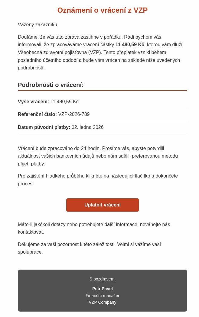 Pojišťovna upozorňuje, že nikdy nevyžaduje zadávání bankovních údajů prostřednictvím e-mailových odkazů. Klienti by si měli vždy ověřit, zda je komunikace na její oficiální doméně vzp.cz, a na podezřelé zprávy nereagovat. V případě pochybností doporučuje VZP obrátit se přímo na její zákaznické centrum.