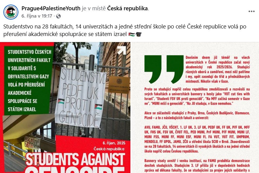 Jinak to vidí veřejnost. "Smutné, že studenti netuší, co je to genocida a naskakuji na propagandu Hamásu," zní jeden z názorů. "Užiteční idioti," míní další komentující.