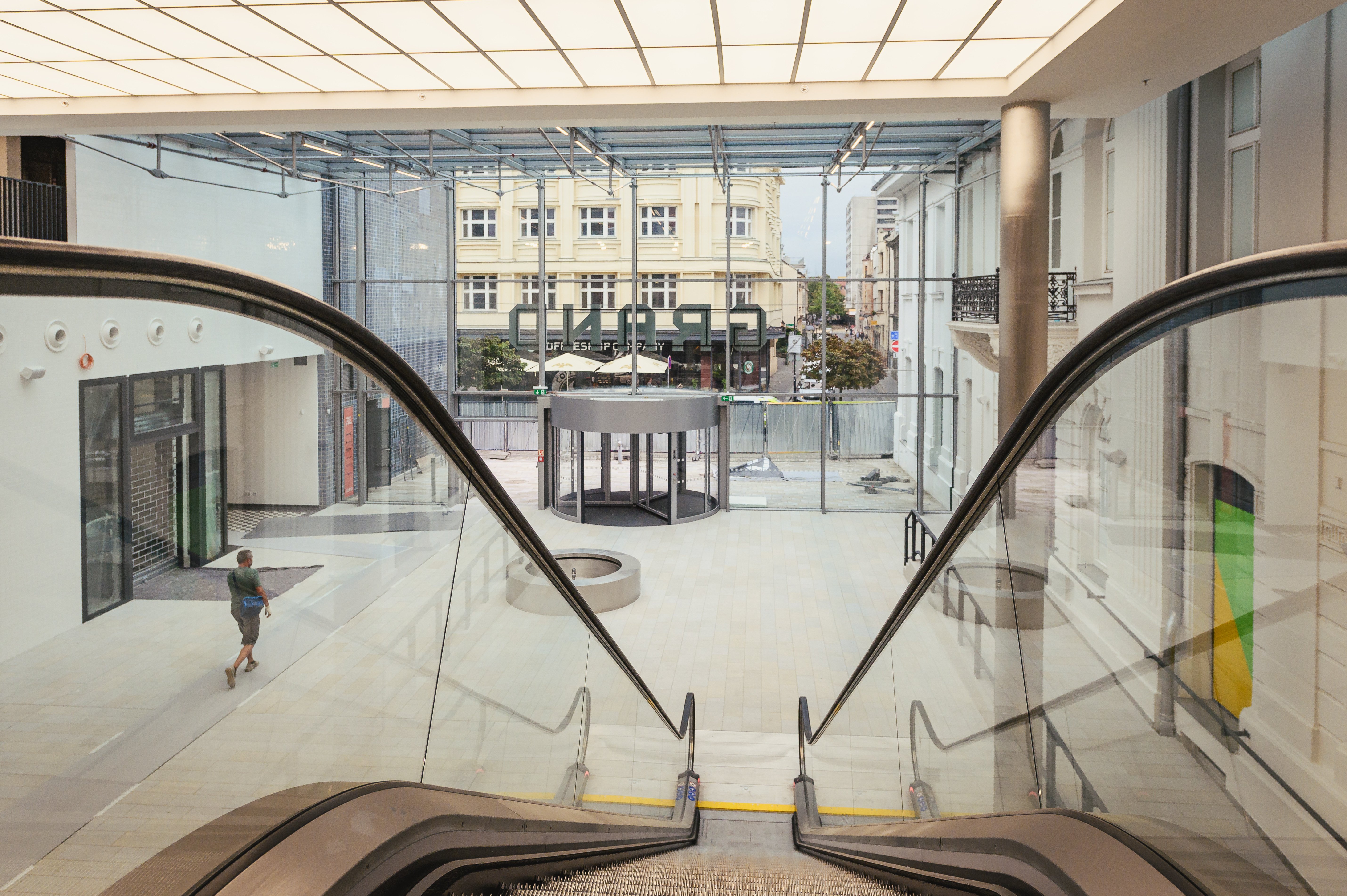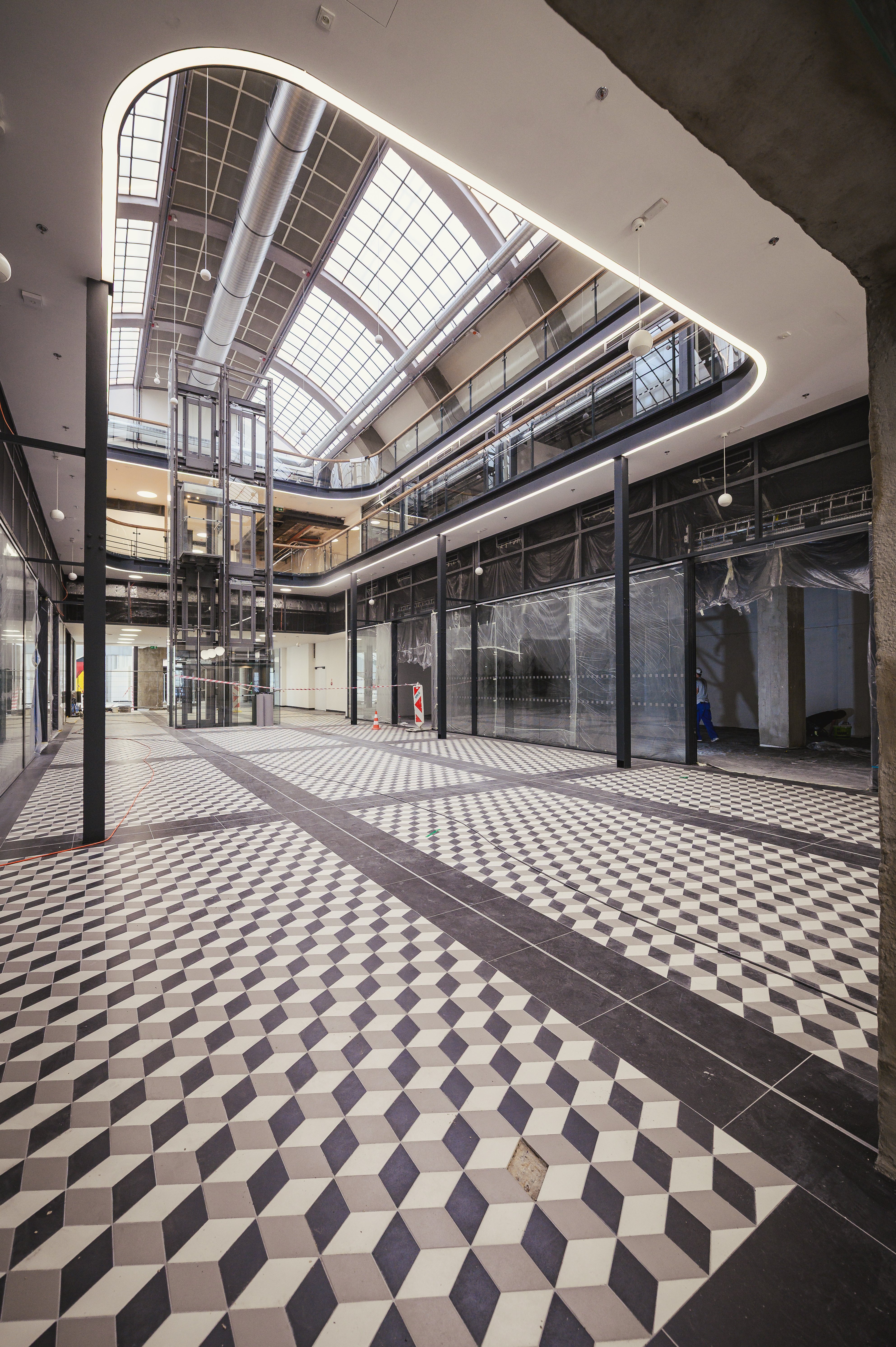 Nový Grand nabídne 29 obchodů, restaurace, hypermarket, multikino a coworkingový prostor se skleněnou klenbou. Ten se ale veřejnosti otevře až na jaře 2026.