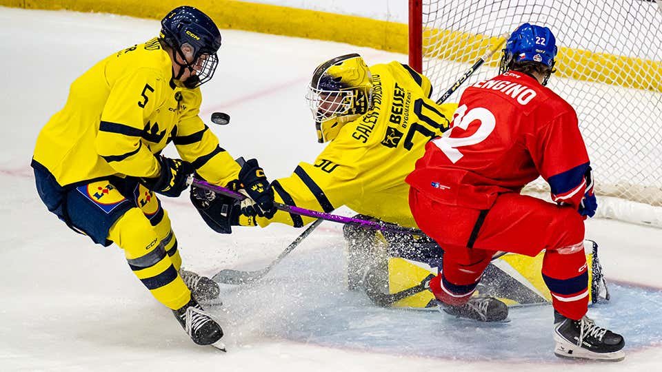 Čeští hokejisté po úspěšném úvodním utkání s Kanadou měli jen sedmnáct hodin odpočinku a v zápase se Švédskem se tato skutečnost na hráčích projevila. Mezi tři tyče se tentokrát postavil Kryštof Štěpánek a začátek zápasu mu nevyšel podle plánu. Češi po dvanácti minutách po trefách Sundströma a Karlssona prohrávali o dvě branky. Češi se vrátili do hry gólem do šatny, kdy se v poslední minutě první části prosadil střelou z otočky Šimon Šejc.