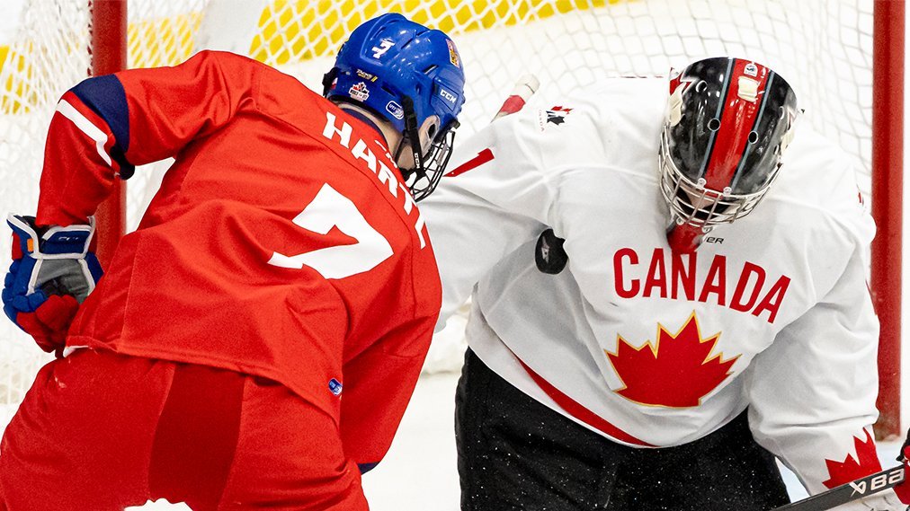 O čtyři minuty později ale Češi znovu vedli. Dva domácí hráči zlomili hokejky, čeští mladíci toho okamžitě využili a Michal Hartl se z ostrého úhlu prosadil na 2:1. Kanaďané však stihli vyrovnat gólem Kaydena Stroedera těsně před koncem druhé třetiny.