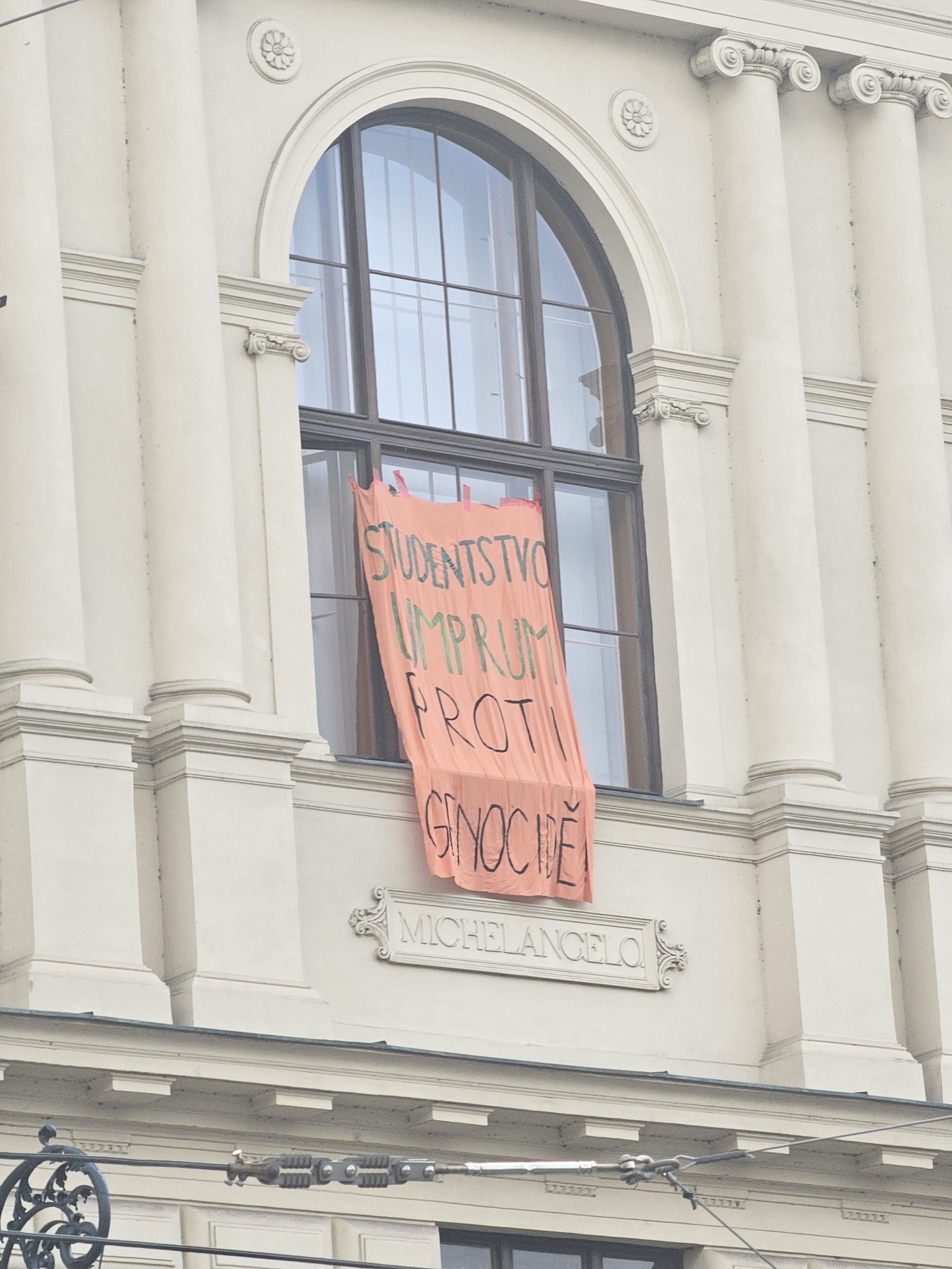 Také na budově UMPRUM se objevil transparent na podporu Palestiny. Podobný incident se tam stal loni v dubnu, kdy tam visela palestinská vlajka. Škola ji okamžitě nechala sundat.