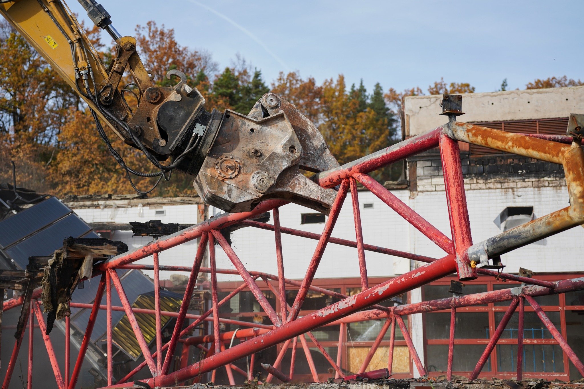 „Nejprve odstraníme ocelové konstrukce, následně budou bourané nadzemní části budovy,“ uvedl Tomáš Picek z demoliční firmy. Na místě pracuje 30tunový bagr s hydraulickými nůžkami a kladivem.