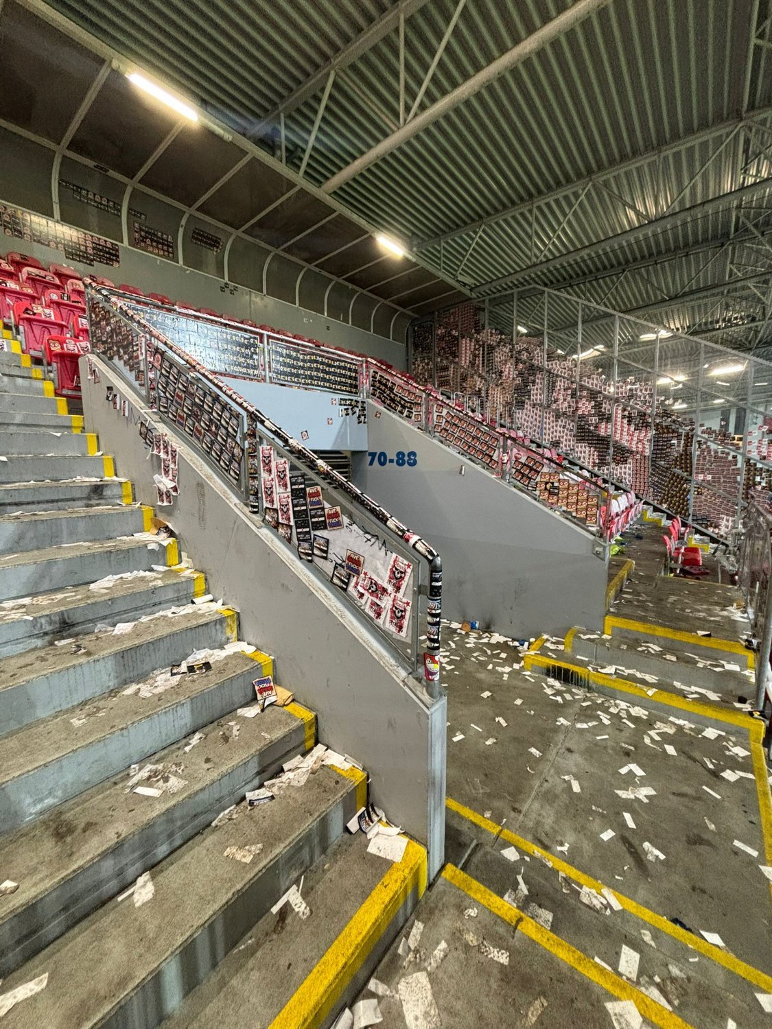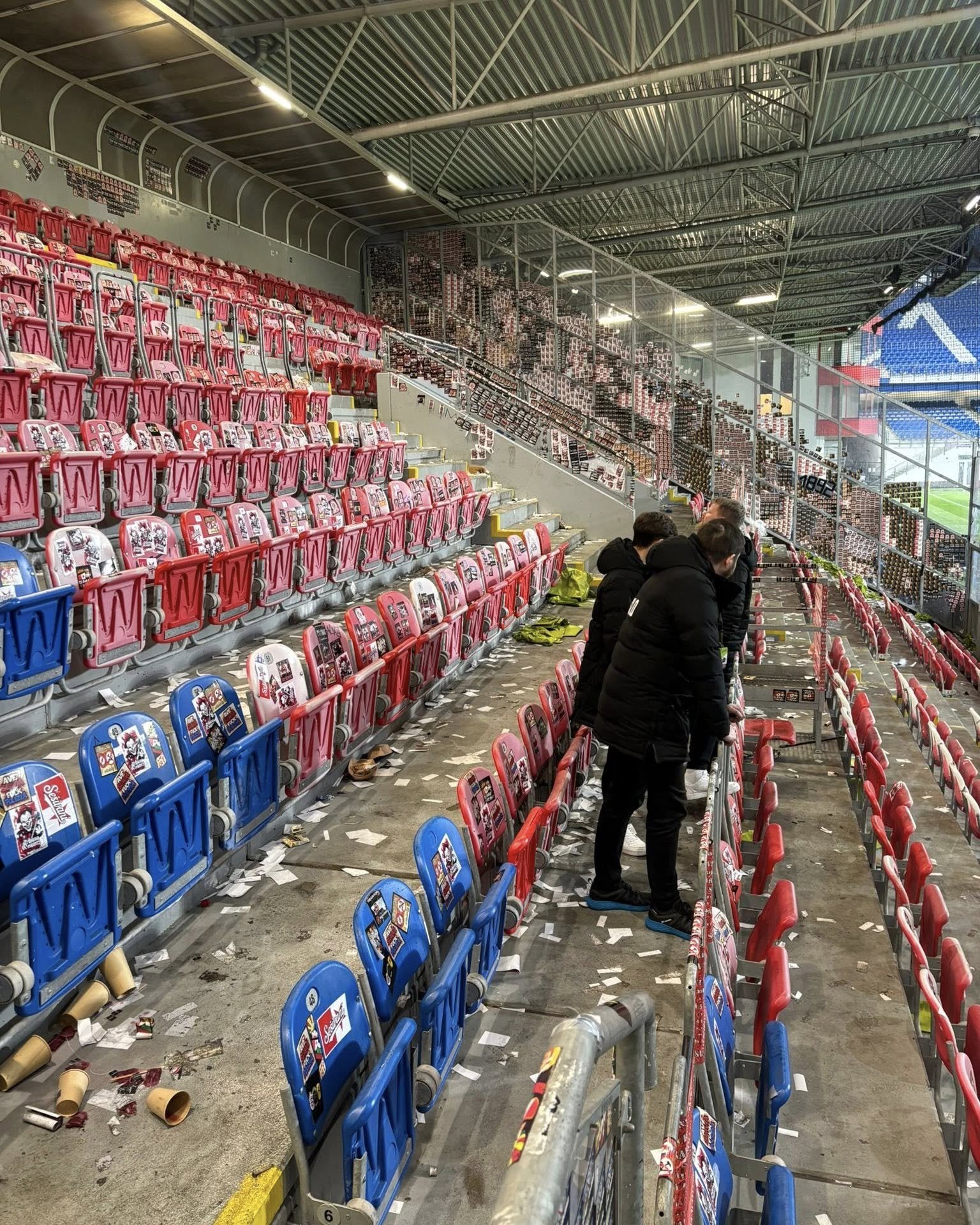 V sektoru hostů došlo navíc k výraznému poškození vybavení, jsou tam vytrhané sedačky, poškozené sociální zařízení či polepená plexiskla. Klub aktuálně sčítá škody, které se pohybují v řádech statisíců.
