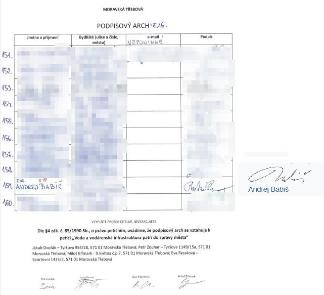 Pod peticí figuruje jméno předsedy ANO Andreje Babiše a jeho podpis, který se ale zcela liší od toho na oficiálních dokumentech. Babiš už městu potvrdil, že petici nepodepsal, přestože o to organizátoři dvakrát žádali.