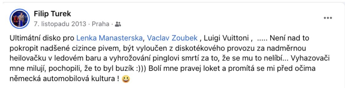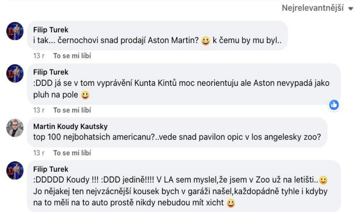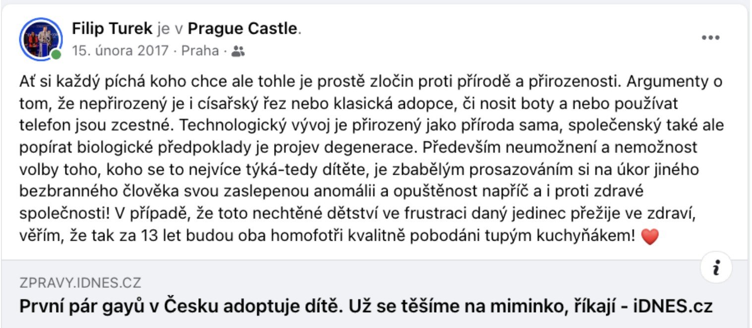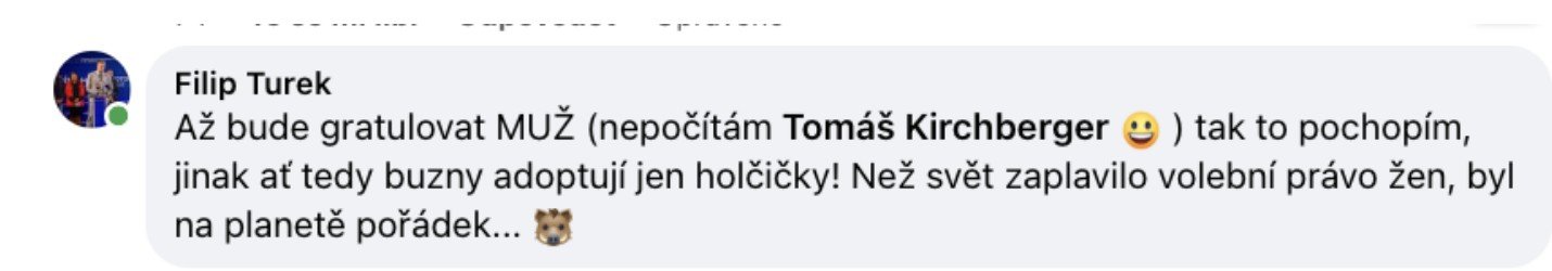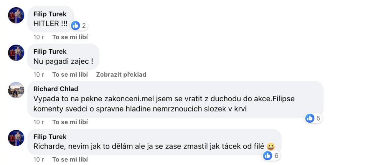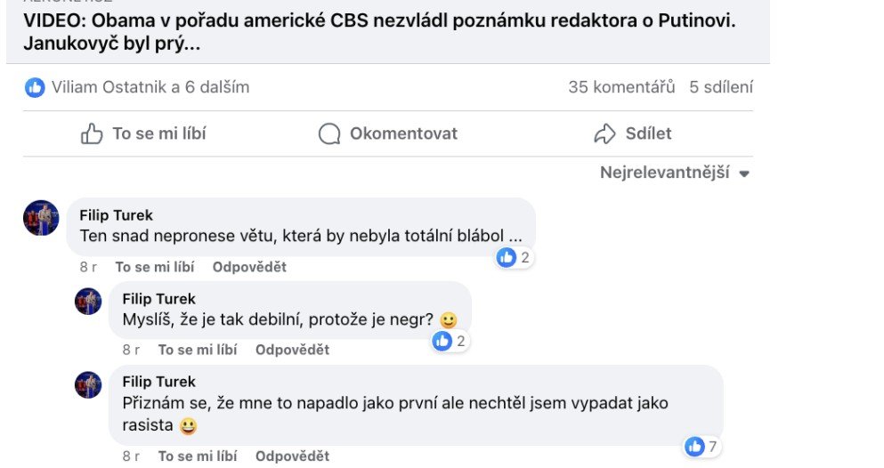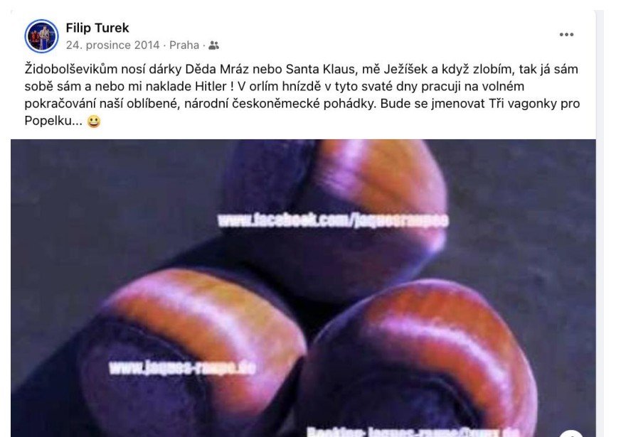 "Tohle, co jsem teď napsal, by mne od nás na západ stálo společenské postavení na několik let," píše poslanec Filip Turek aspirující na post ministra zahraničí v jednom ze svých příspěvků. Ukazuje je 42stránkový dokument, který zveřejnil Antonín Pášma ze Štítu demokracie. „Redakce Štítu demokracie byl zaslán dokument, který pečlivě mapuje kontroverzní statusy a komentáře Filipa Turka. Dokument má neuvěřitelných 42 stran a všechny screenshoty jsou opatřeny i původními odkazy a daty, kdy byly vytvořeny. Dokument také vyvrací obhajobu Turka ohledně profilové fotografie – všechny příspěvky mají profilovou fotku z doby, kdy screenshoty vznikly, tedy z června 2024. Stejný dokument mají pravděpodobně i další média, ale vzhledem k závažnosti obsahu jsme se rozhodli ho anonymizovat, odstranit metadata a zveřejnit v plném znění,“ napsal Pášma.
